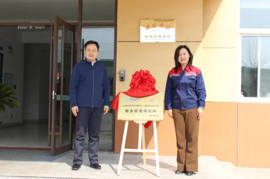 院长李文佐与山东奥友生物科技股份有限公司董事长夏淑玲共同为“联合抗菌研究所”揭牌。