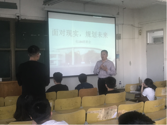 最后,段志国做总结发言。表示自己是化184班的一员,希望今后与同学们多交流、多联系、院里也会全力帮助同学们解决各种困难。同时也对班级近期的学习、纪律和文体活动等工作表示了肯定,对实实在在的班会内容感觉不虚此行。段志国还为化184班全体同学提出了三点要求:一、自信,进了烟大的门就是烟大的人,英雄不问出处,希望同学们要增强自信,树立正确的人生观;二、坚持,同学们即将面临毕业,无论大家想考研还是想考公,还是就业,都要选择一个坚定的目标去努力,不要犹豫;三、团结,一个优秀的班集体也是一个团结一致的班集体,大学的感情是一辈子最值得珍惜的回忆,大家在平时的学习生活中,善于与同学沟通,要相互理解和支持,心胸坦荡。段志国还与同学们现场交流,对同学们提出的问题进行了答疑解惑。