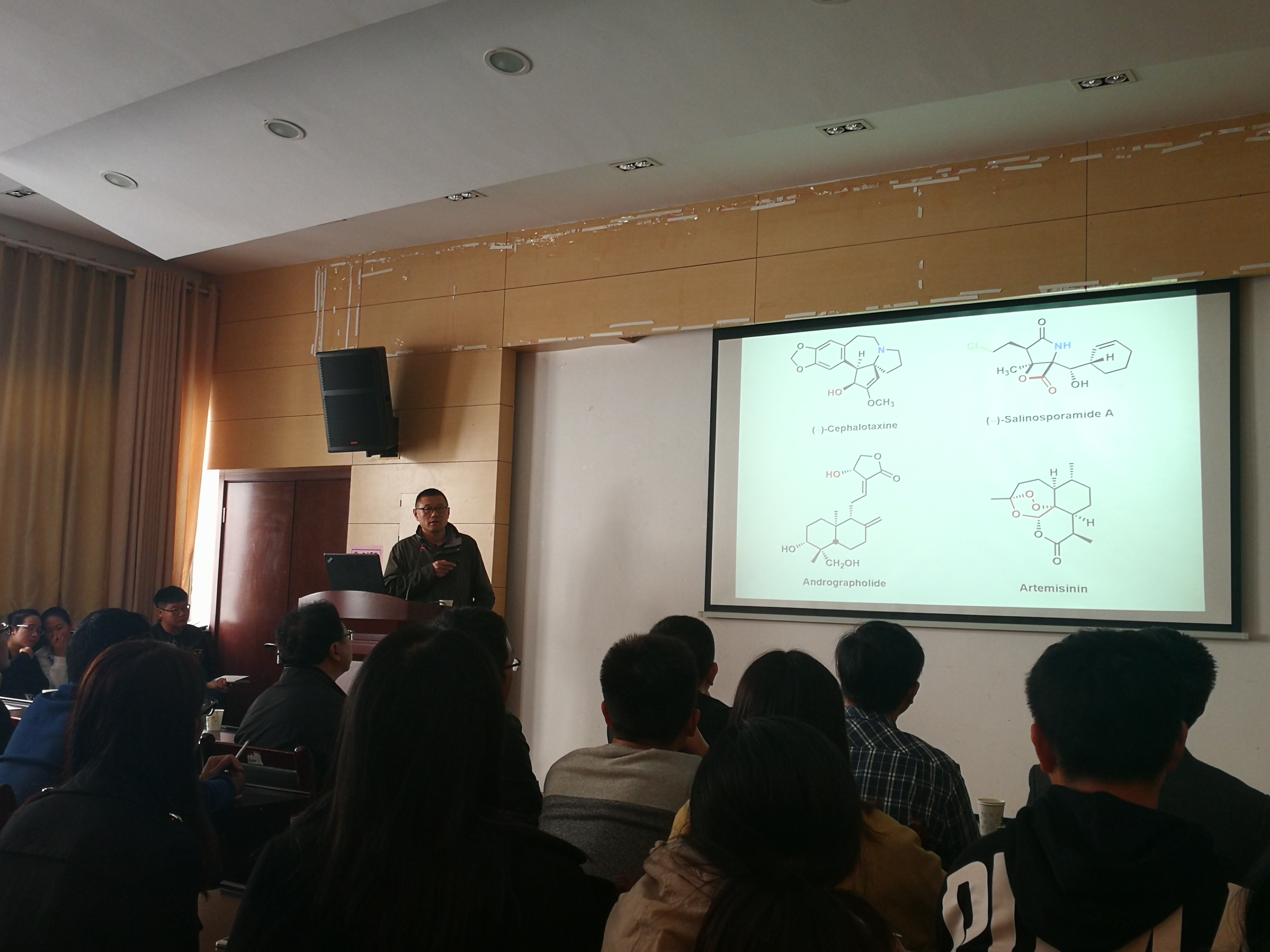 李教授多年来一直致力于天然产物及药物分子的全合成研究,在报告的开始李教授简明扼要的介绍了天然产物化学及其研究意义:天然产物化学研究是人类认识和探索大自然及生命奥秘的重要科学领域,天然产物是生命进化和人类自身调节过程的重要物质基础。在接下来的报告中,李教授重点介绍了其课题组多年来对多种天然产物(药物)进行仿生化学合成所取得的多项研究成果以及该领域的发展前景和存在的挑战。李教授的报告引起了参会者极大的兴趣,多名教师和同学与李教授进行了广泛的学术交流,李教授对大家的问题都做了耐心、详细的解答。