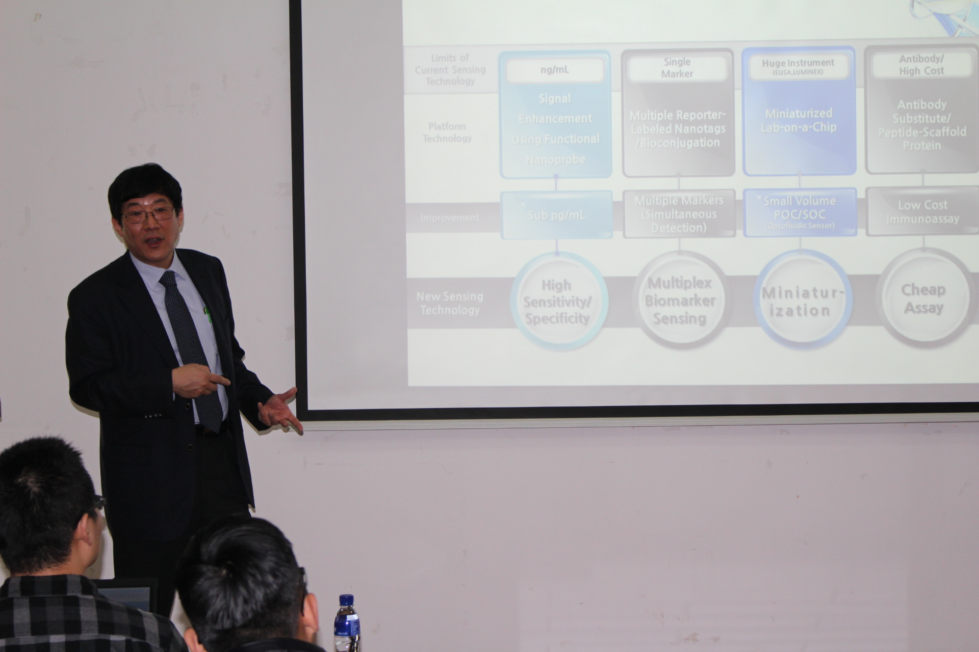师生做了题为《Application of Optical Nanosensor for Clinical Diagnostics》的学术报告,报告内容形象生动,主讲人结合课题组最新的研究成果以及相关研究领域发展前沿与大家进行了交流,朱宰范教授给大家带来的不仅是国际前沿的学术知识,更让我们对如何更好地投身于科学研究中进而更快地解决科学问题有了更加清晰的认识。精彩的报告内容引起了听众极大的兴趣。报告结束后朱宰范教授还与听众进行了互动交流。