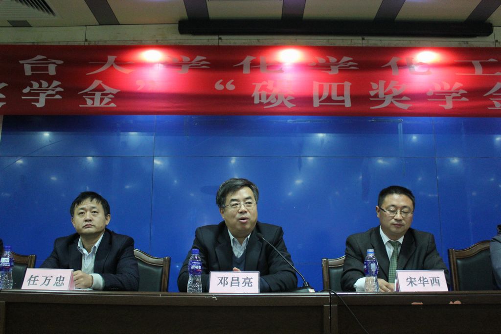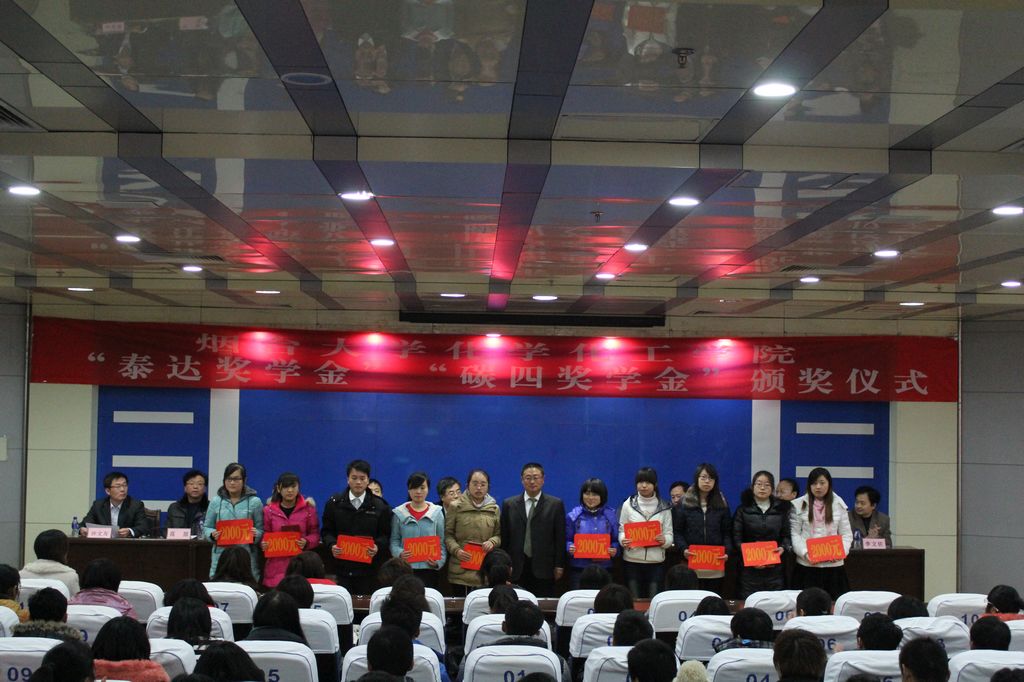 关于颁发2011-2012年度“泰达”奖学金的决定》。烟台泰达集团董事长宋华西先生向获得“泰达”奖学金的获奖同学颁奖并合影留念,与会领导向获得“碳四”奖学金获奖同学颁发了获奖证书,孙春阳同学和贾兵同学分别代表获奖学生发言。烟台泰达集团董事长宋华西先生以“不怕困难、不怕挫折、不怕出头、不怕失败、不怕吃苦、不怕低头“的“六个不怕”精神激励广大同学,要勇于面对困难,发奋图强,争做国家栋梁之才。随后,副校长邓昌亮发表讲话,他首先感谢泰达集团和碳四分离项目课题组的慷慨善举,在我校设立奖学金,并对5楼自拍
