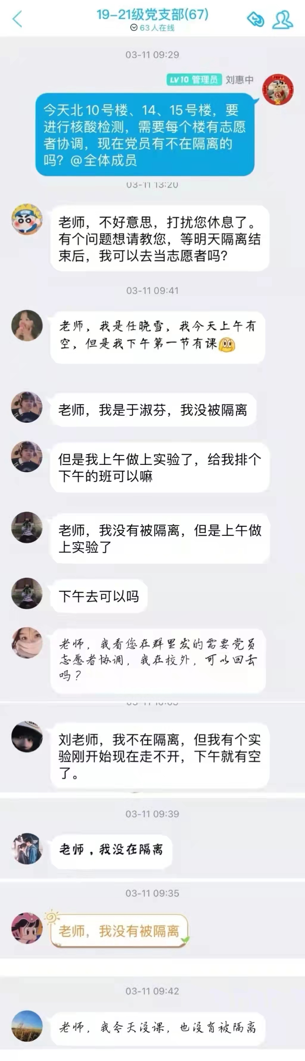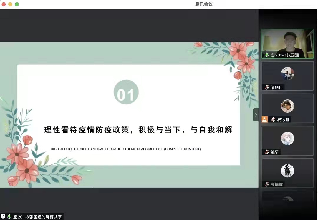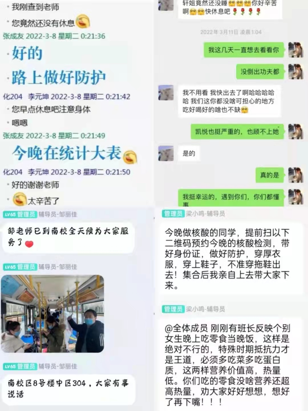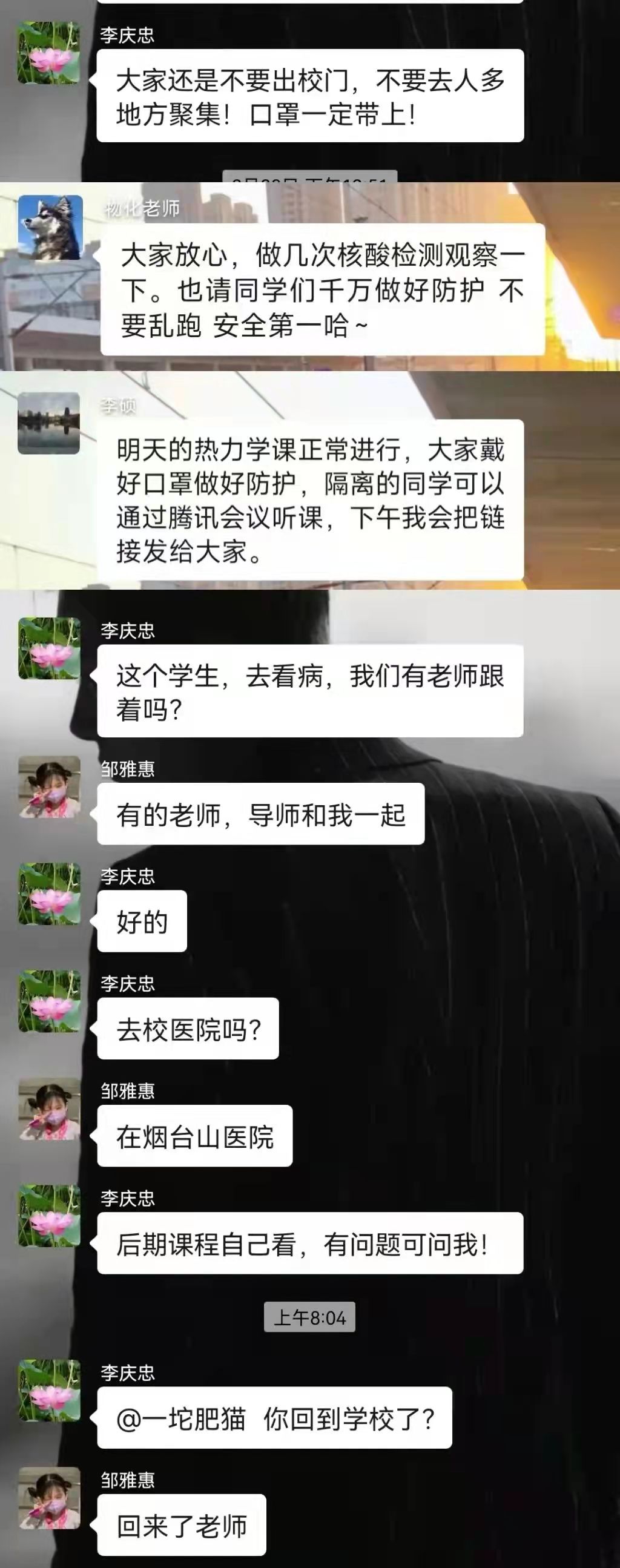 党委书记段志国、副院长赵玉潮,正在通过腾讯会议与居宿留观的同学聊天谈心,聊学习、聊家常、聊生活、聊未来。同学们纷纷表示,“本以为学院领导是高高在上的,这次面对面聊天感觉就像自己的爸爸妈妈一样亲切。”