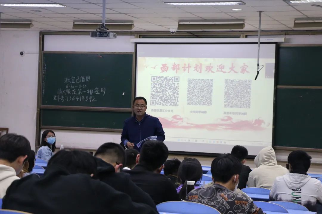 2.更好地助力大学生就业,学院于4月27日晚19:00在综合楼308举办学院2022届毕业生就业创业工作动员大会暨“西部计划”宣讲会,宣讲会激发了同学们志愿服务西部计划的热情和动力,帮助毕业生合理地调整自己的就业理想和价值取向,树立主动融入国家发展大局观念。