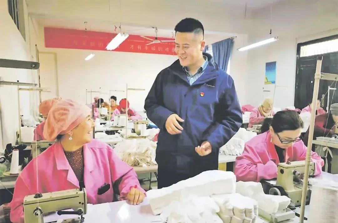 逄子剑在莎车县城北街道手套厂了解群众就业情况