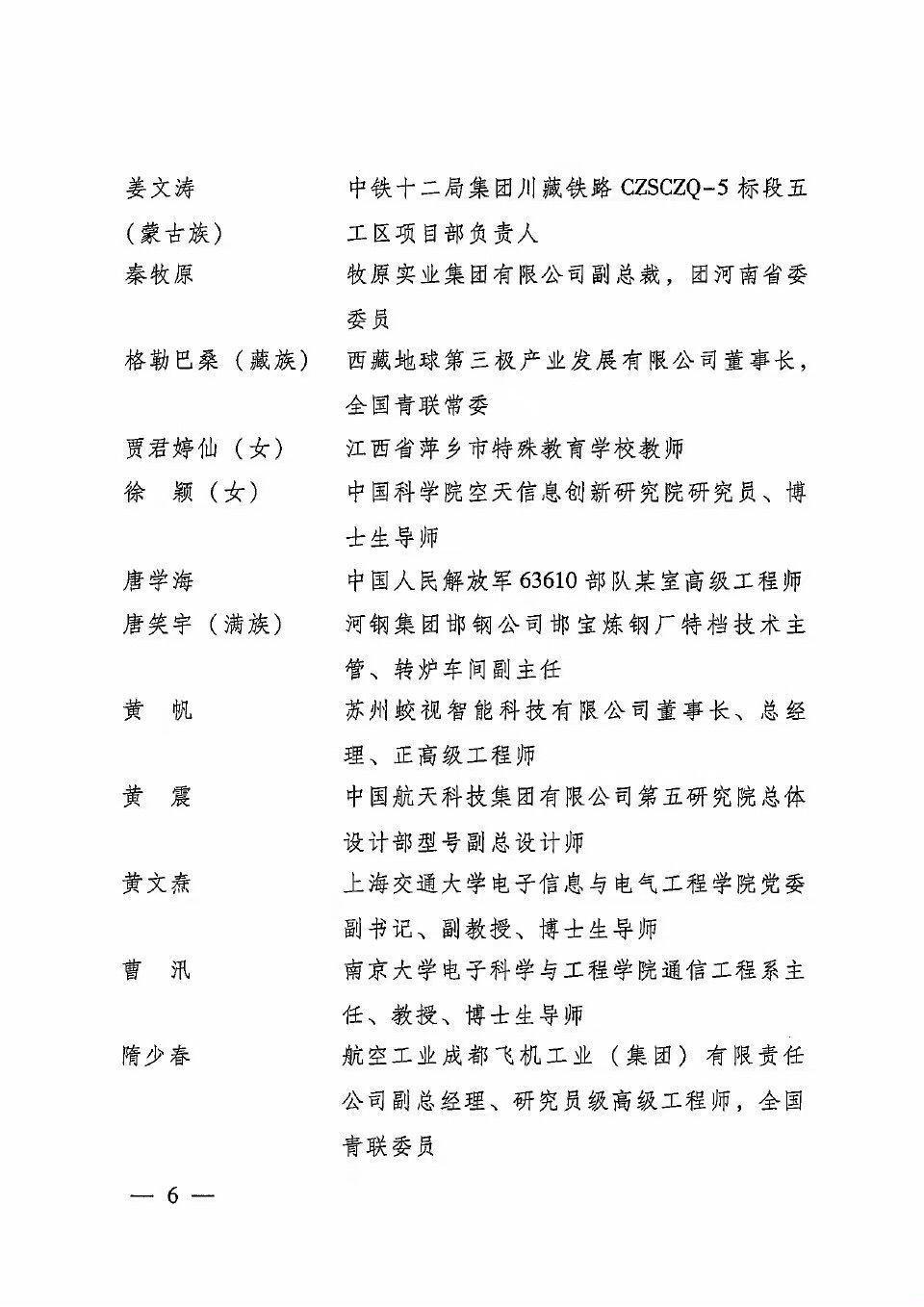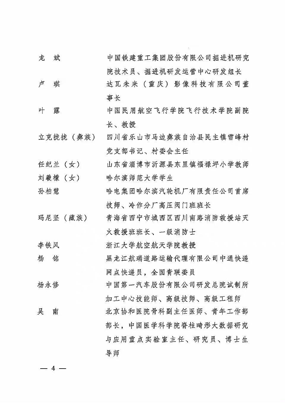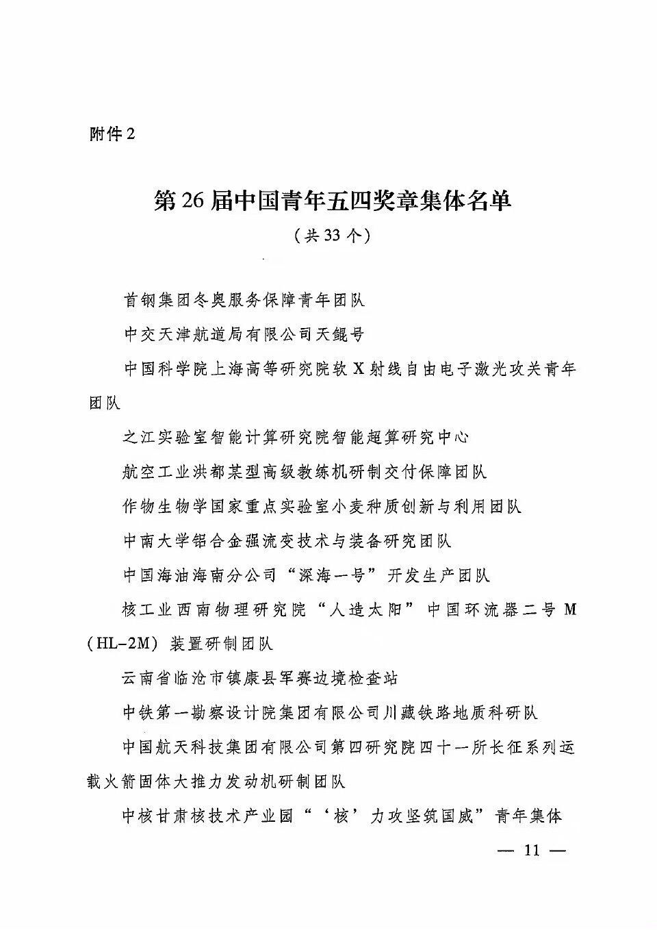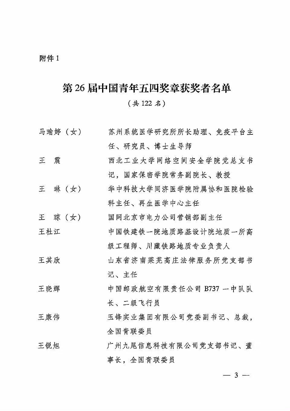 5月3日,在建团百年到来之际,为充分发挥青年典型模范带头作用,激励广大青少年踔厉奋发、勇毅前进,以优异成绩喜迎党的二十大胜利召开,共青团中央、全国青联决定,授予马瑜婷等49名同志第26届中国青年五四奖章,授予首钢集团冬奥服务保障青年团队等16个青年集体第26届中国青年五四奖章集体。确认冯韶伟等73名同志获第26届中国青年五四奖章、中国航天科技集团有限公司第六研究院八〇一所载人航天推进系统部等17个青年集体获第26届中国青年五四奖章集体。