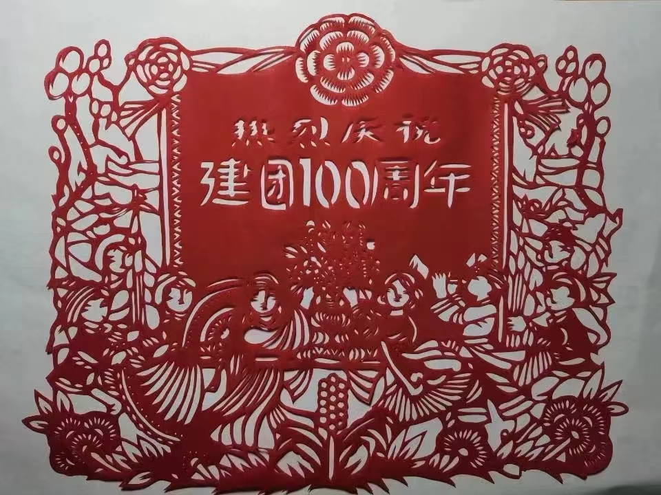 本剪纸中各族青年拥护团的旗帜展示出新青年要立鸿鹄志、做奋斗者。同时也象征着我们青年一代在爱国主义精神的引领下,披波斩浪,勇往直前。百年风霜雪雨,百年大浪淘沙,团的精神星火不息,青年有感在心。