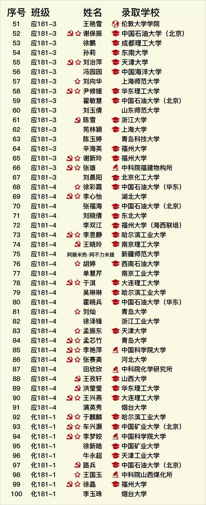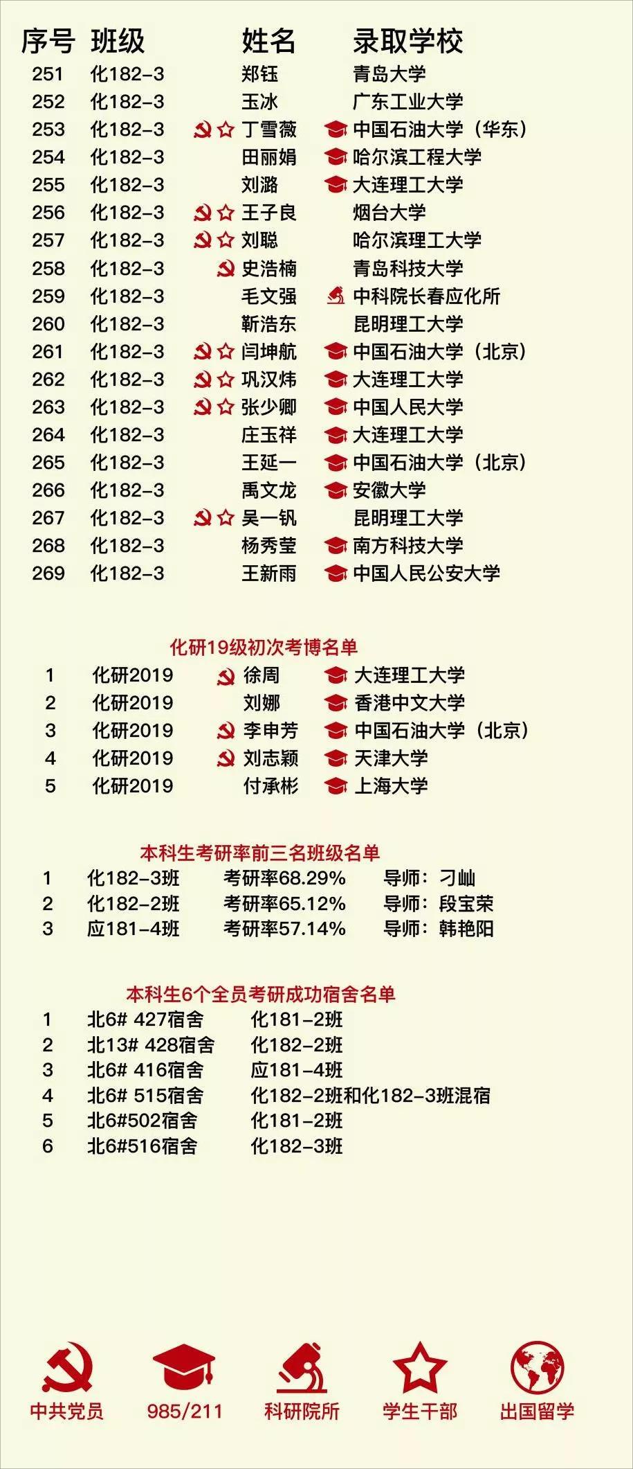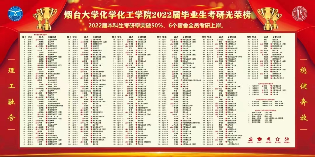 升学作为毕业生高质量就业最主要的方面,学院一直非常重视夯实学生基础知识、基本技能的培养,不断强化学生的专业教育、科研素养和学术意识教育。近五年来,学院考研(博)率稳步提升。2017年至今,本科毕业生初次考研率从最开始的30%多,稳步提升到突破50%。今年,2018级本科生共有269名学生成功考取硕士研究生,化182-1团支部25名同学考研全部过线,其中24名同学被985和211录取;全院六个宿舍全体考研成功,被多家媒体报道;2019级研究生中有5名同学考取博士研究生,实现历史最高。