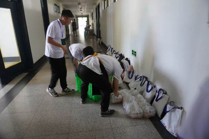 志愿者们将参赛学生们的书包摆放得整整齐齐。