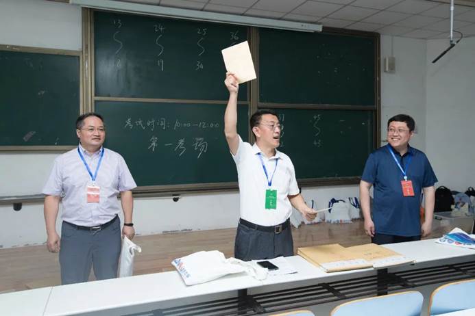 本次大赛专家委员会组长艾宁(中)、全国大学生化工实验大赛华北赛区秘书长范江洋研究员(左一)在考试现场,当众抽取理论考试试卷。