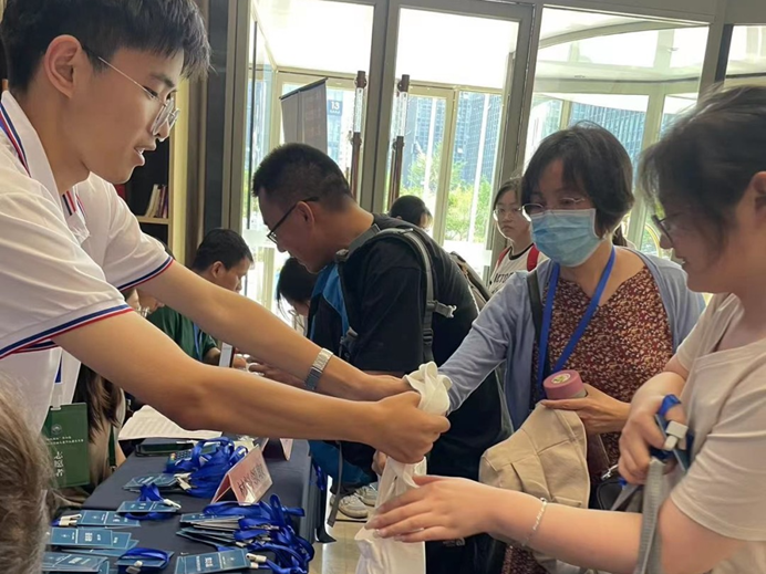 志愿者为报到的参赛师生发放胸牌等材料。