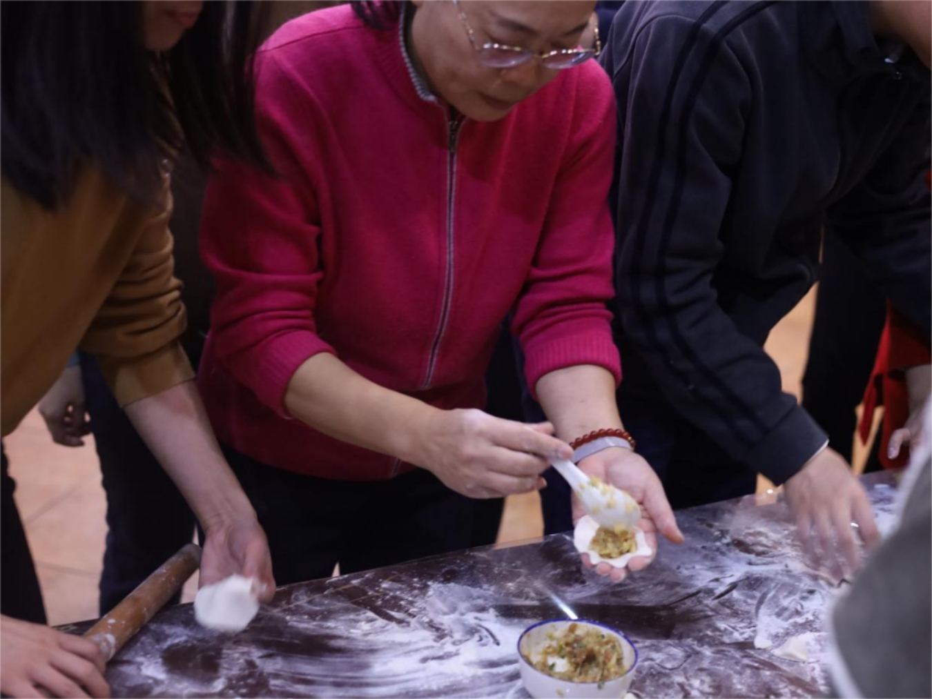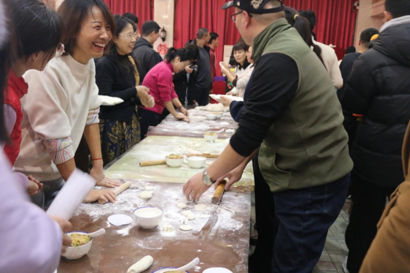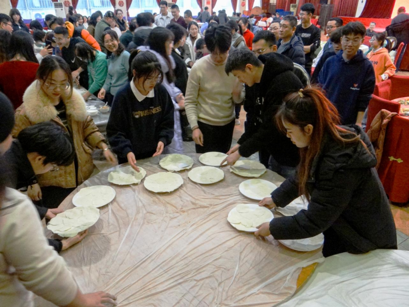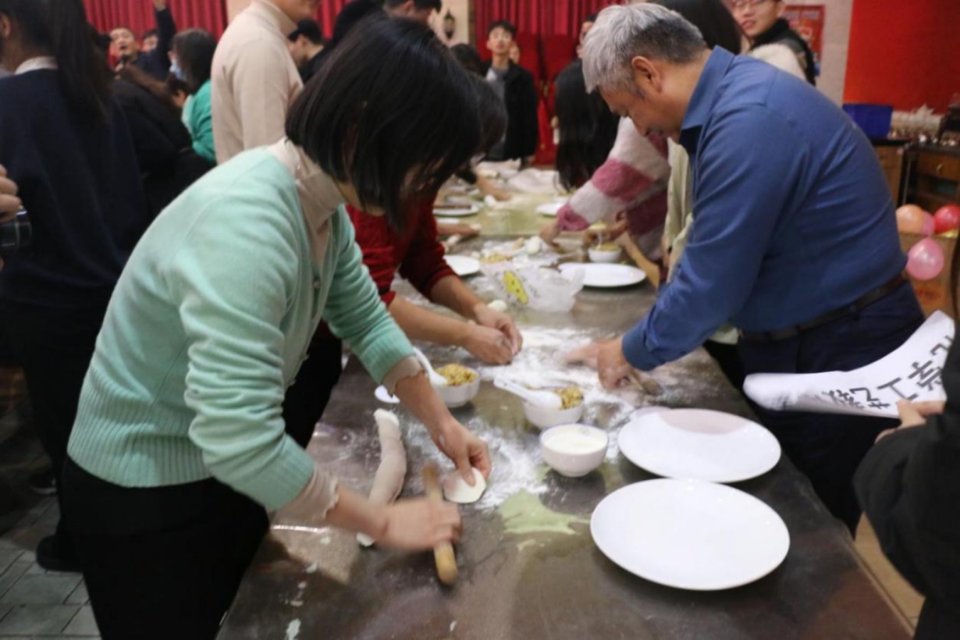 晚会之前的第一个环节就是:擀饺子皮比赛——“疯狂饺子皮”和饺子选美比赛——“晒晒精致饺子”。教师工会小组和同学代表分成12支队伍,一起和面、擀皮、包饺子,开启了一场紧张激烈又轻松美好的擀皮儿、包饺子大赛。大家围在桌前,各尽其能,欢声笑语此起彼伏,整个场面欢快轻松,热闹非凡,别有一番趣味。