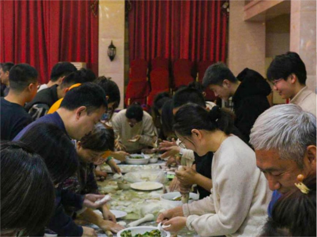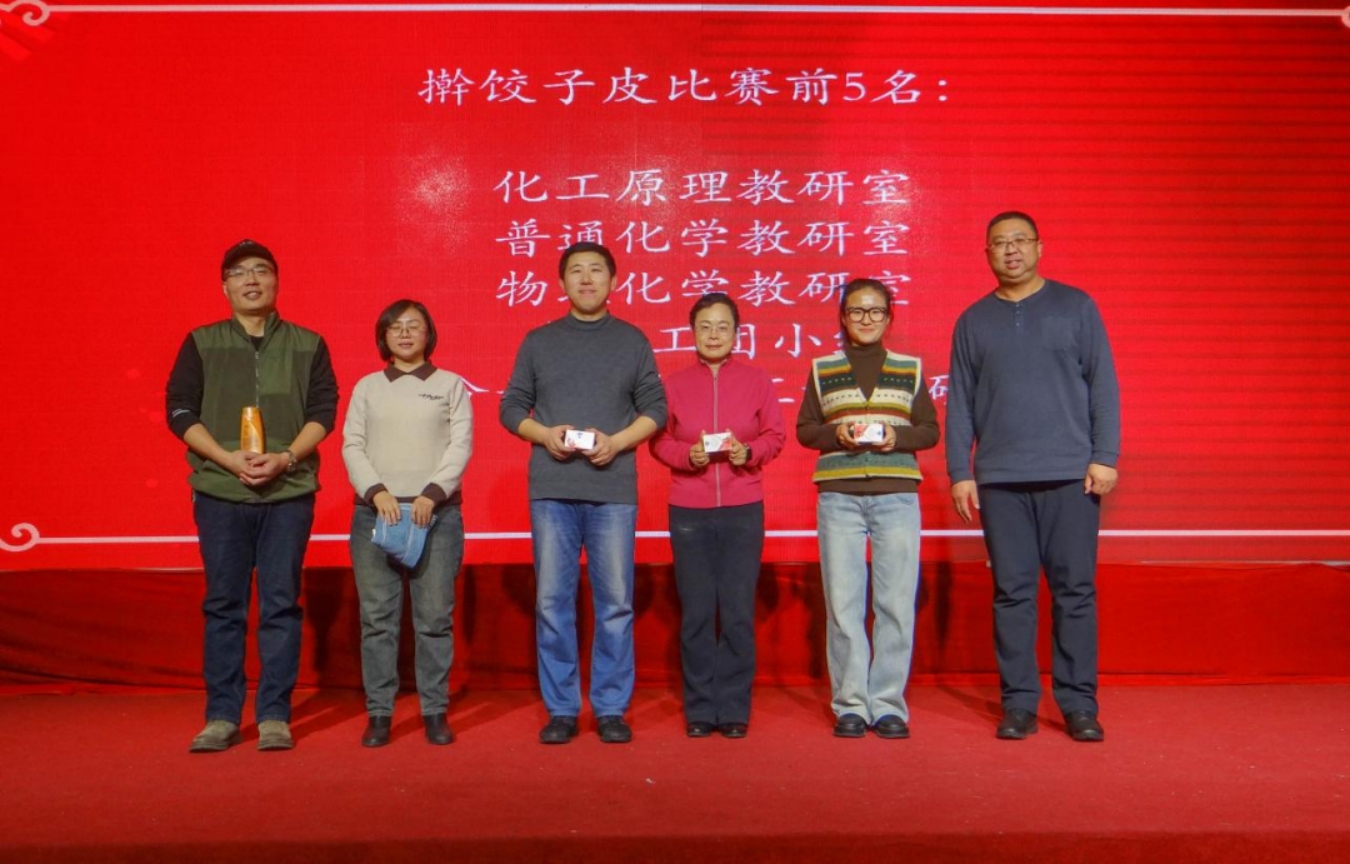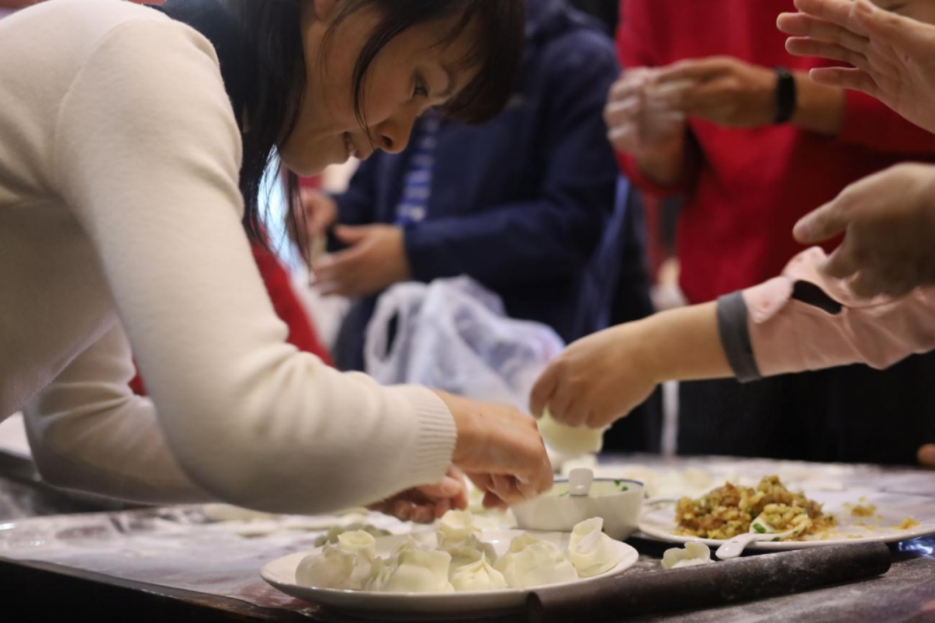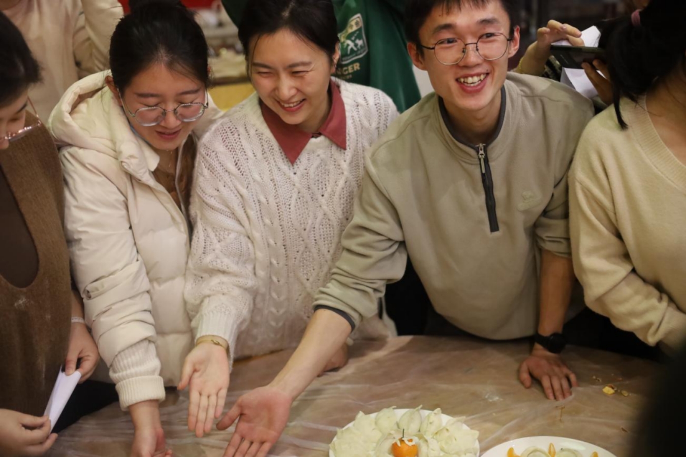 晚会之前的第一个环节就是:擀饺子皮比赛——“疯狂饺子皮”和饺子选美比赛——“晒晒精致饺子”。教师工会小组和同学代表分成12支队伍,一起和面、擀皮、包饺子,开启了一场紧张激烈又轻松美好的擀皮儿、包饺子大赛。大家围在桌前,各尽其能,欢声笑语此起彼伏,整个场面欢快轻松,热闹非凡,别有一番趣味。