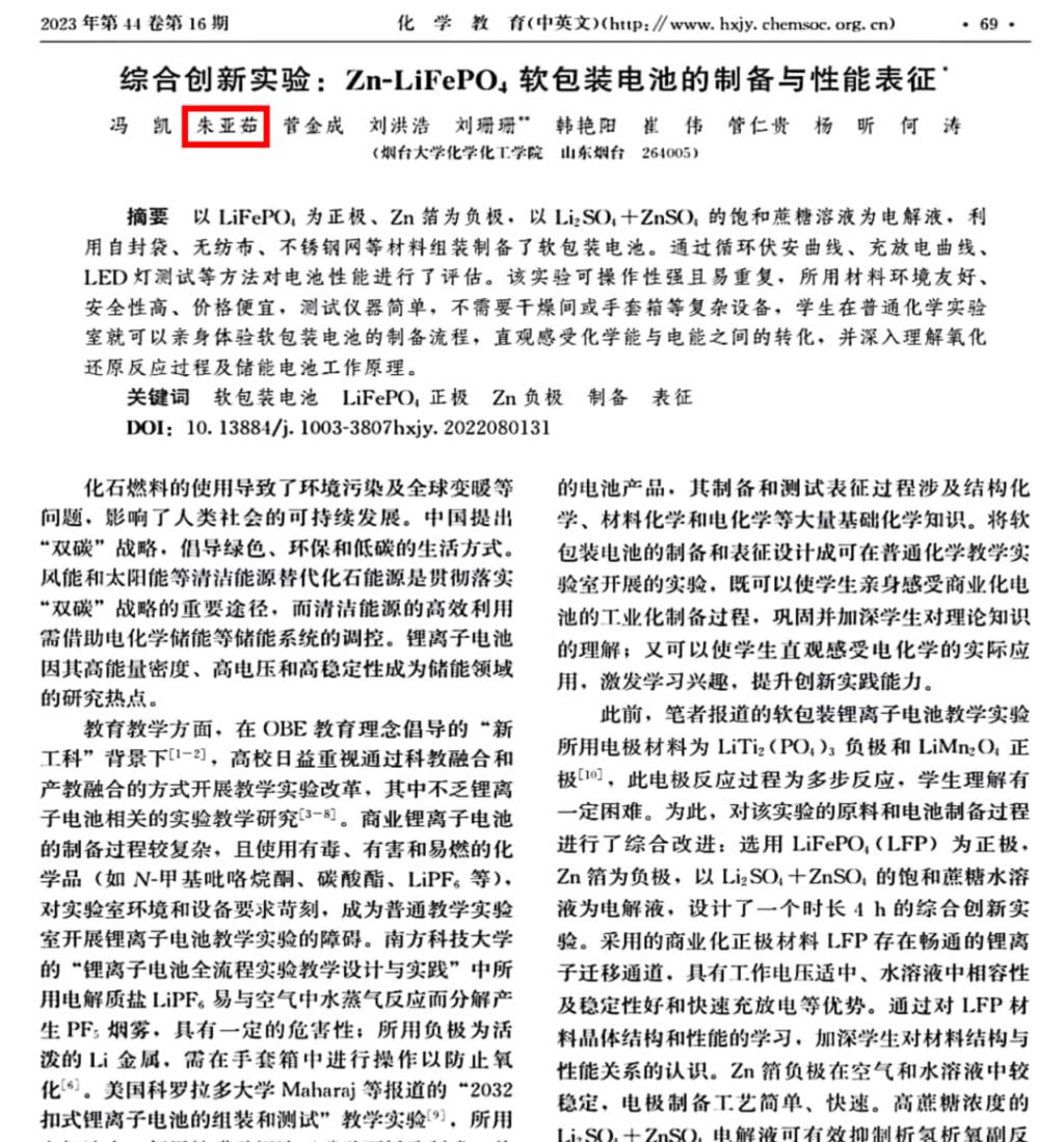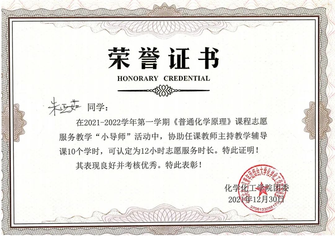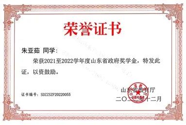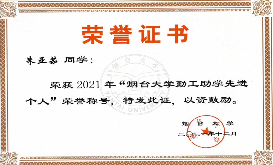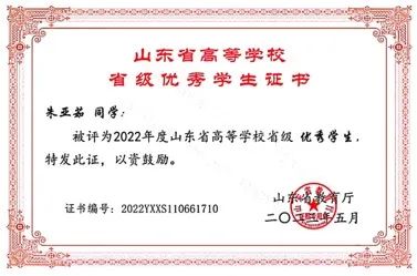 朱亚茹,中共预备党员,2020级应用化学专业本科生。学习成绩连续三年专业第一,综合测评成绩始终保持在专业前三名,绩点排名专业第一,以第二作者身份发表SCI二区论文三篇。曾获“国家励志奖学金”、“山东省政府奖学金”、“金正环保创新奖学金”等学业奖学金。积极参与科研、学术竞赛,获得第十三届“挑战杯”全国大学生创业计划竞赛国家级铜奖、第三届全国大学生化学实验创新设计大赛“微瑞杯”华北赛区竞赛一等奖、第八届山东省“互联网+”大学生创新创业大赛金奖、第十三届山东省大学生创业计划大赛一等奖、第十三届大学生科技节-山东省大学生物理竞赛二等奖、2022年山东省研究生高端化工与功能材料创新实践大赛二等奖等奖项。积极参加社会实践和志愿服务活动,累计志愿服务时长超过300小时。积极参与班级工作,现任班级宣传委员,获得2022年度山东省高等学校省级优秀学生、5楼自拍