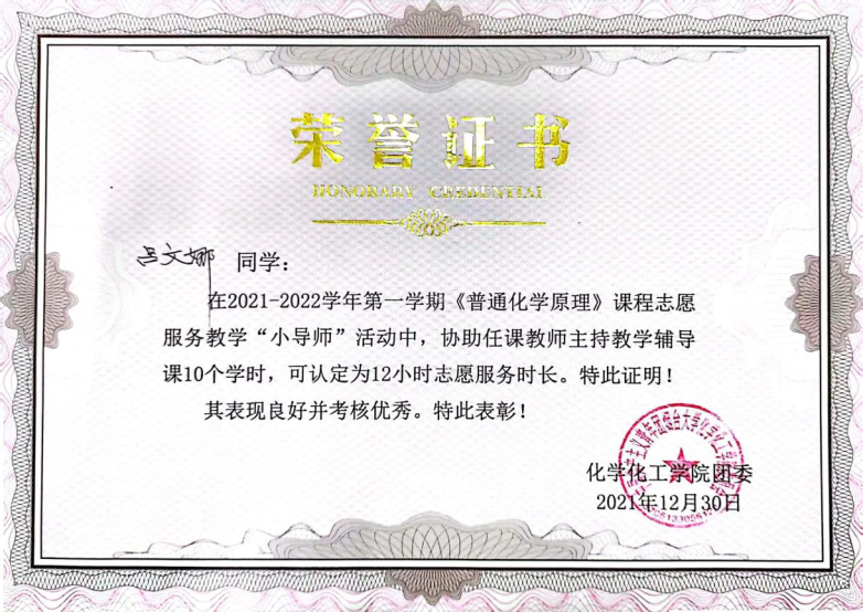 谈及学习方法,在有机化学科目的学习上,她说机理和合成题很重要,要着重去训练,对不会的题目进行标记,反复练习出错的题目,加深印象;在普通化学原理科目上,要以课本为基础,认真复习课本,再与题目相结合进行强化。