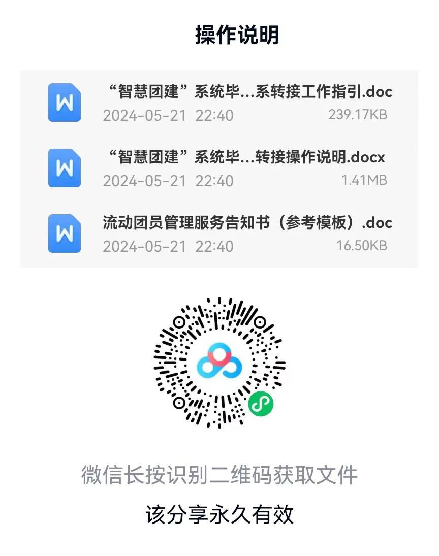 扫描下方二维码,获取《"智慧团建"系统毕业学生团员组织关系转接工作指引》、《"智慧团建"系统毕业学生团员组织关系转接操作说明》、《流动团员管理服务告知书(参考模板)》等内容。