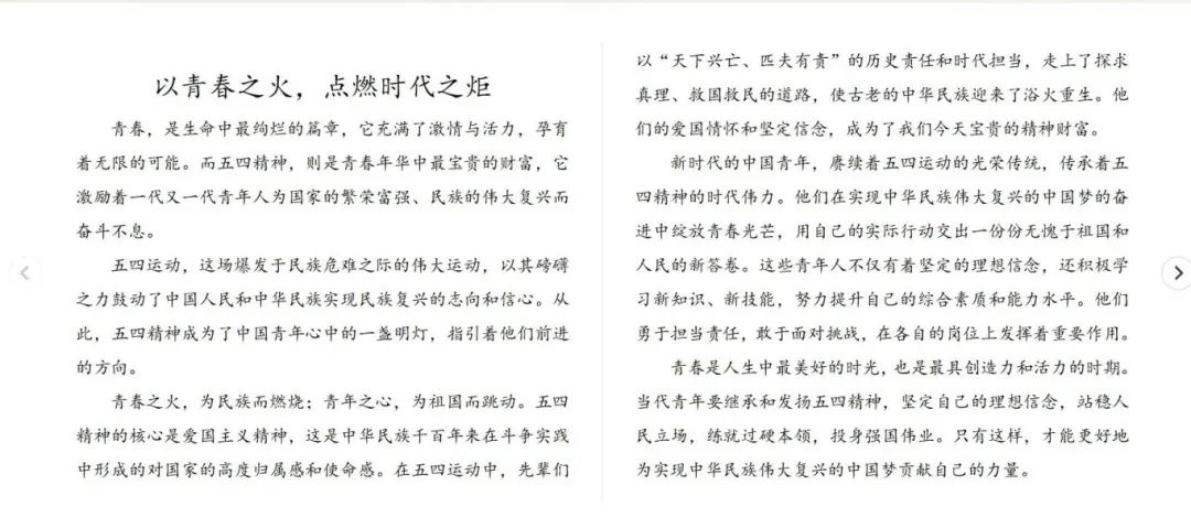 征文大赛于5月4日开始征集作品,院团委理论学习部对所有参赛作品进行匿名编号,大赛成立由老师和同学们共同组成的评委会对作品进行打分。参赛者们以五四精神为内核,结合自身的成长经历、感悟与思考,撰写出一篇篇充满激情与力量的文章。他们从不同角度、不同层面阐述了五四精神的时代价值与现实意义,展现了青年知识分子在爱国奋斗中的坚定信念与执着追求。