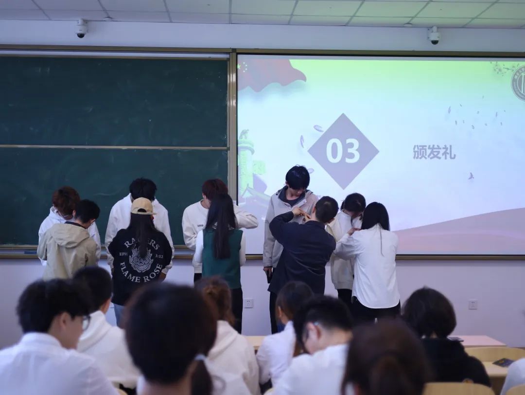 院团委辅导员老师们为新团员佩戴团徽、颁发团员证。