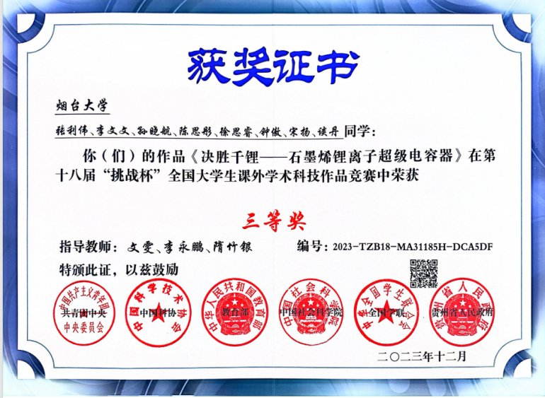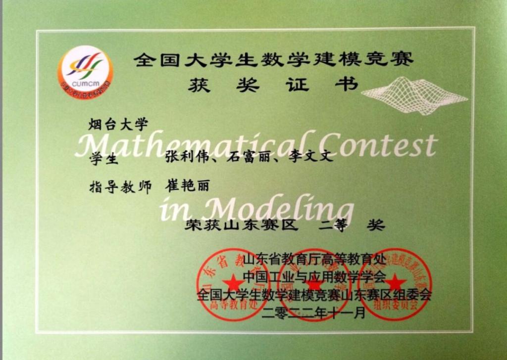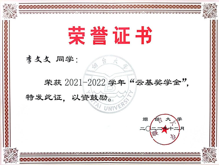 “互联网+”大学生创新创业大赛校赛二等奖;全国大学生数学建模竞赛二等奖;山东省公益创新大赛省级一等奖;2023年大学生创新训练计划(大创)校级立项等奖项。她还曾获得“志愿服务先进个人”,“优秀共青团干部”等荣誉称号;获云基奖学金,“金正环保”社会实践奖学金,优秀学生奖学金,国家励志奖学金等。