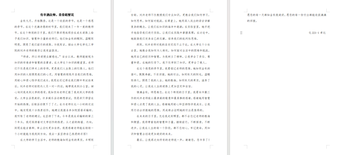 亲爱的老师,在人生的各个阶段,感谢您用知识,丰盈我们的内心;感谢您言传身教,示范做人的道理;感谢您用宽容和鼓励,伴我们走过偶尔的迷茫;感谢您帮我们插上翅膀飞往更辽阔的天地。最后,对所有“化小水”的老师们说一声:“教师节快乐,您辛苦了!”