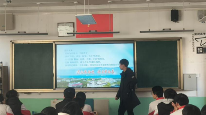 应241-1班赵芳博:在本次宣传工作中,我回到了山东聊城第二中学,向学弟学妹们宣传5楼自拍