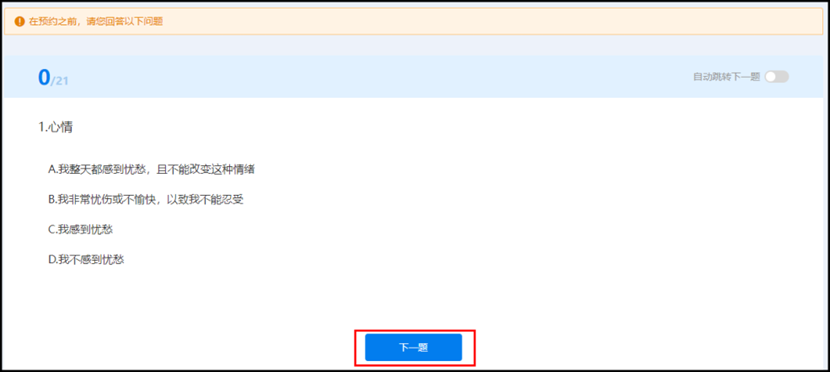 ③填写问卷,完成21道问题后即可看到咨询师排班信息,请认真作答