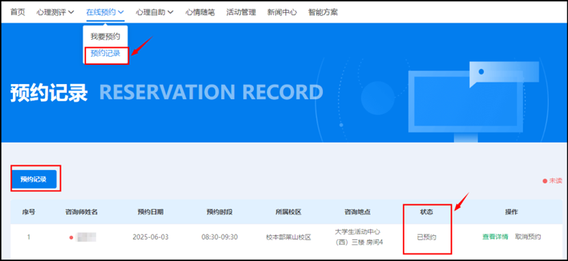 ⑥咨询师点击“确认预约”后,预约状态从“待确认”变成“已预约”,表示预约完成,请按时前来咨询!