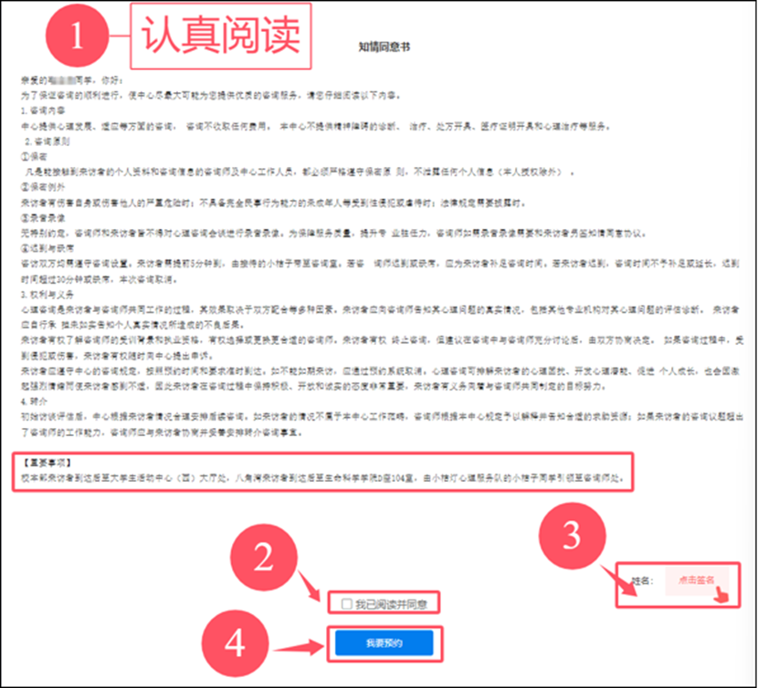 ①点击在线预约,认真阅读知情同意书后,点击“我已阅读并同意-点击签名”