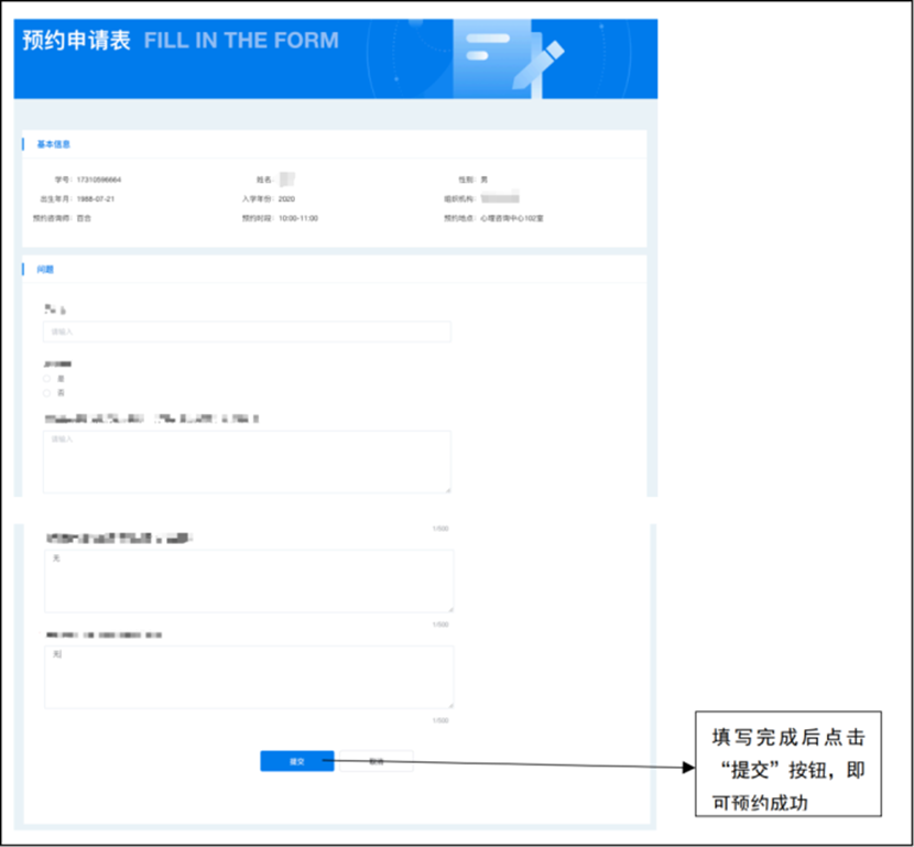 ⑤填写预约申请表,即表示你已成功向咨询师发送了预约申请,需等待咨询师确认!