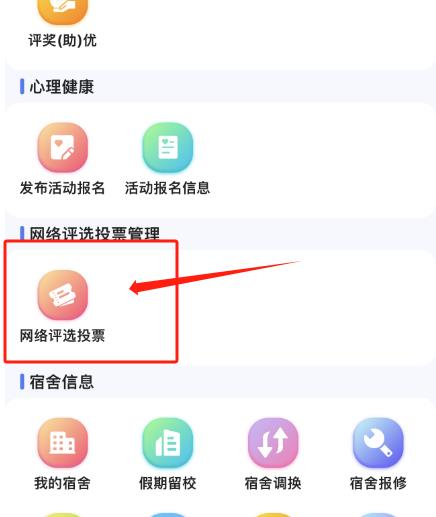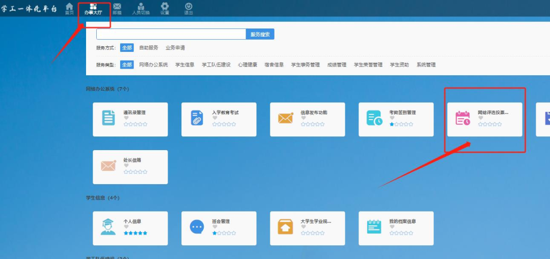 5.点击办事大厅,找到并选择“网络评选投票”模块。