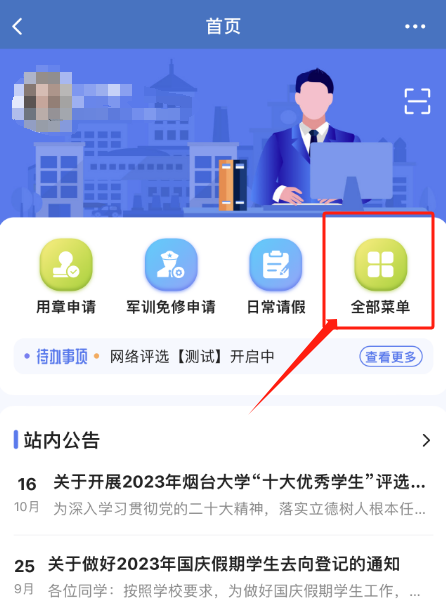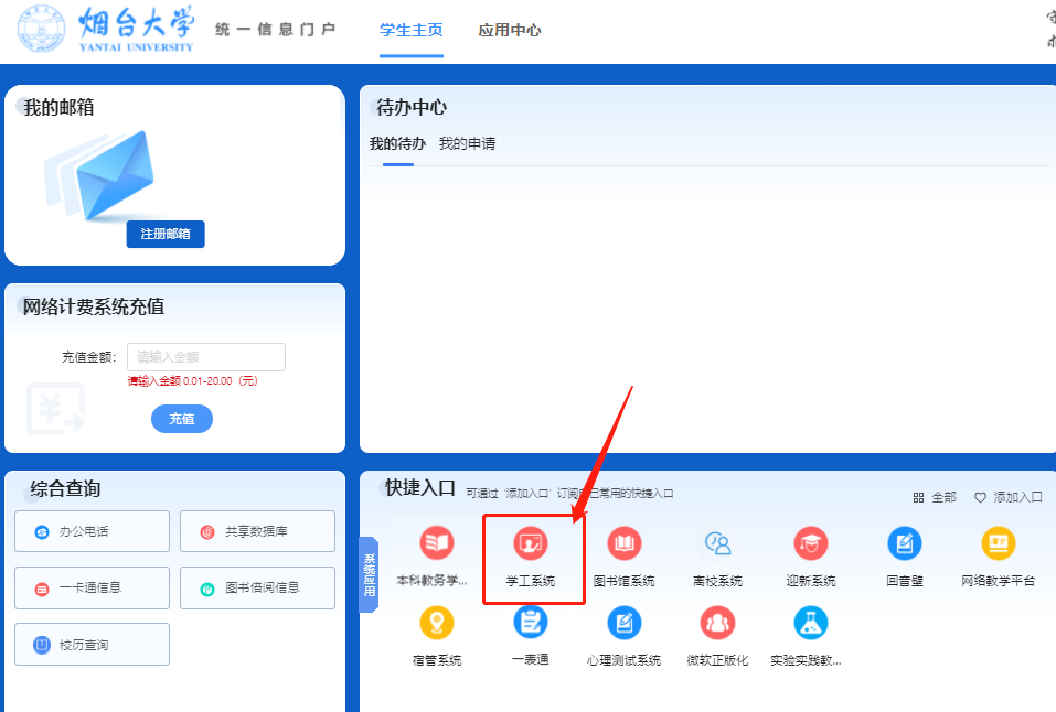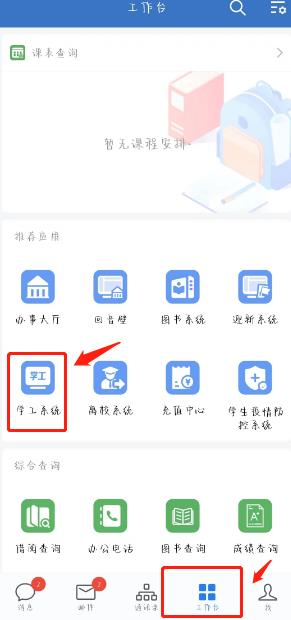 1.打开“企业微信”APP,选择工作台,点击“学工系统”。