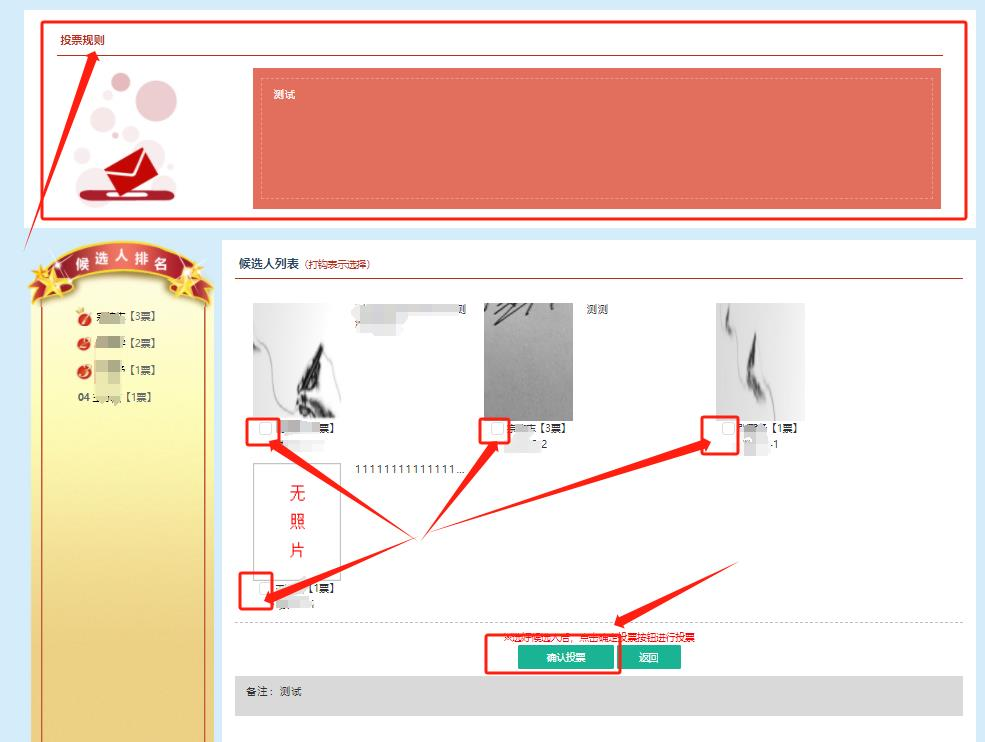 8.阅读“投票规则”,在目标候选人下方的方框处打钩,最后点击“确认投票”;在“候选人排名”处可查看得票排名。
