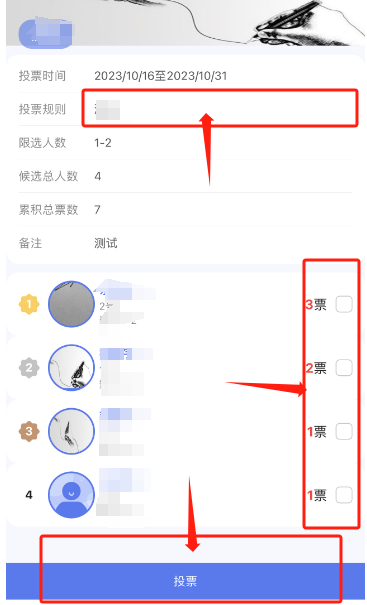 5.阅读投票规则后,在目标候选人右侧方框处打钩,点击“投票”(需注意投票人数需在限选人数范围内)。
