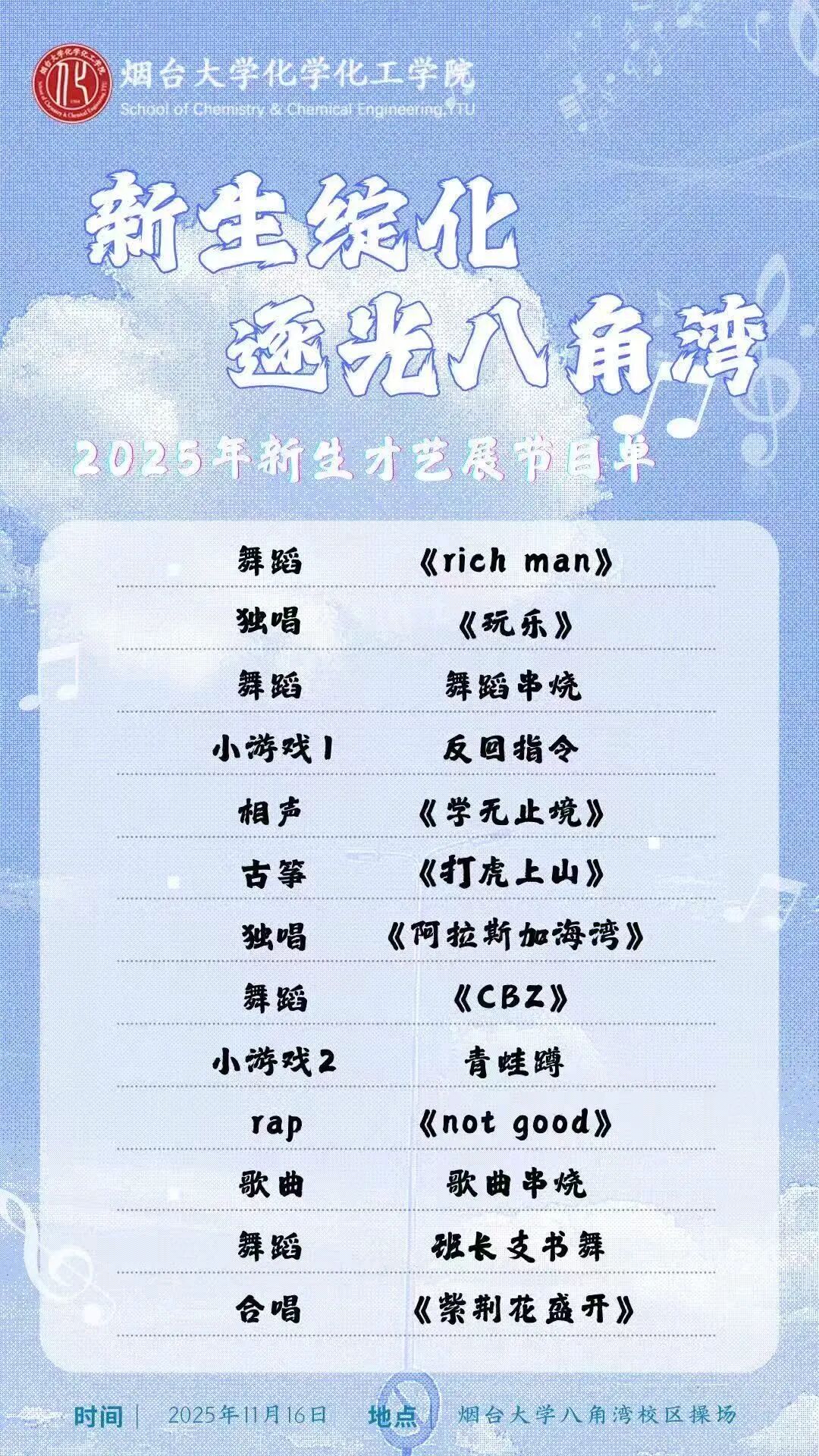 当八角湾的海风轻拂过校园,当化学的分子碰撞出艺术的火花,5楼自拍 2025级新生们,将在11月16日18:30的八角湾校区操场,编织一场关于青春与梦想的诗意画卷。新生绽化·逐光八角湾新生才艺展即将开幕,让我们一起期待吧!