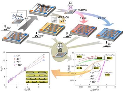 赵玉潮教授团队利用等离子体辅助接枝改性,将甲基丙烯酰乙基磺基甜菜碱(SBMA)及1H,1H,2H,2H-全氟癸基三乙氧基硅烷接枝于聚甲基丙烯酸甲酯(PMMA)材料表面,制作了表面接触角不同的微通道,深入研究了其对气-液两相流动与气泡形成过程的影响规律,为微通道反应器的个性化设计提供了基本科学数据。