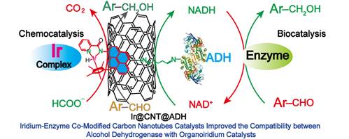 该研究通过两种相互独立的温和偶联方式,将新型的辅酶NADH再生有机铱络合物和乙醇脱氢酶(ADH)依次锚定在碳纳米管材料表面,发展了一种非均相的有机铱-酶级联催化剂,显著改善了有机铱络合物和含巯基生物酶(ADH)之间的生物相容性问题,实现了酶催化芳香醛制芳香醇过程中,高成本辅酶NAD+/NADH的高效循环利用(图1)。该成果提出的策略,将有望降低生物合成生产成本,并促进化学-生物协同催化体系的工业应用。上述工作得到了国家自然科学基金(21904131)、烟台市科技创新发展计划项目(2023JCYJ075)、山东省自然科学基金(ZR2022MB082, ZR2022QB120, ZR2023MB023)等项目的资助。(文/图 赵立军)