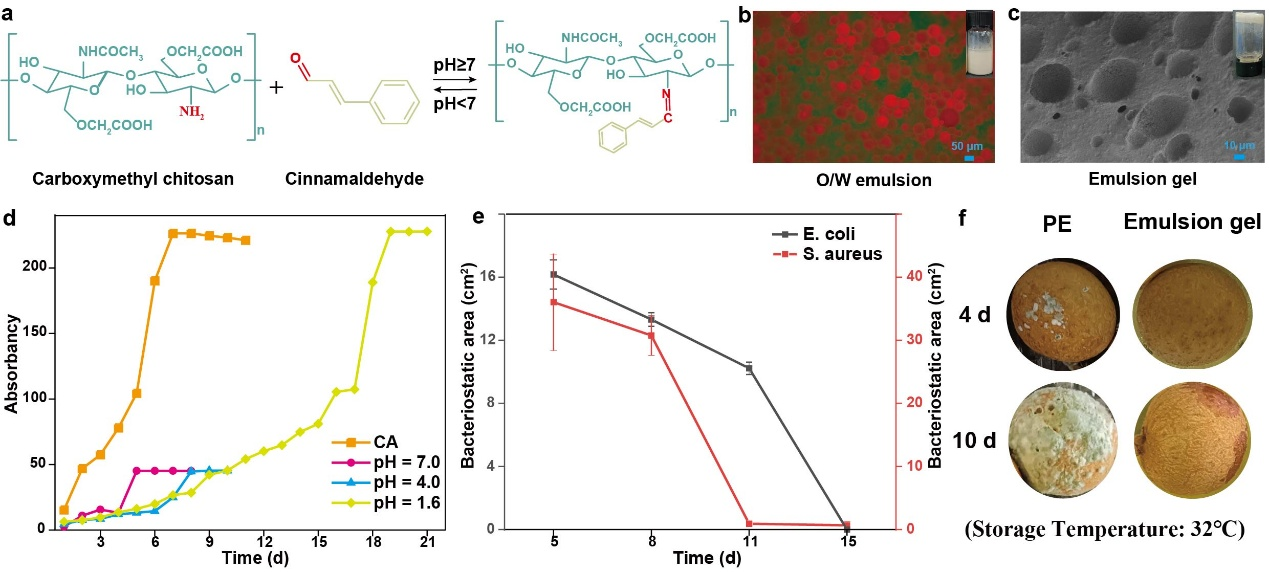 图2. a.乳液界面处的Schiff Base反应;b.水包油乳液的显微镜染色图像(油相:Nile Red); c.乳液凝胶的扫描电子显微镜图像;d. pH响应的肉桂醛释放;e.乳液凝胶的抗菌性能;f.抗菌乳液凝胶用于龙眼保鲜。